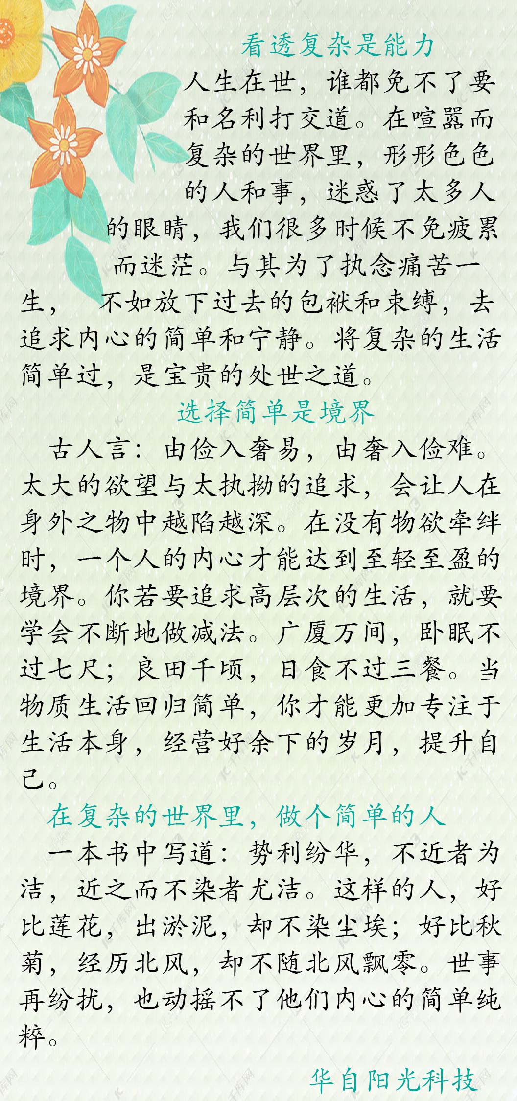 人生会经历这三重境界:看山是山,看山不是山,看山还是山。这揭示了人生更好的状态:在复杂的世界里,做一个简单的人,在看遍世事繁华后,删繁就简,向心而行。